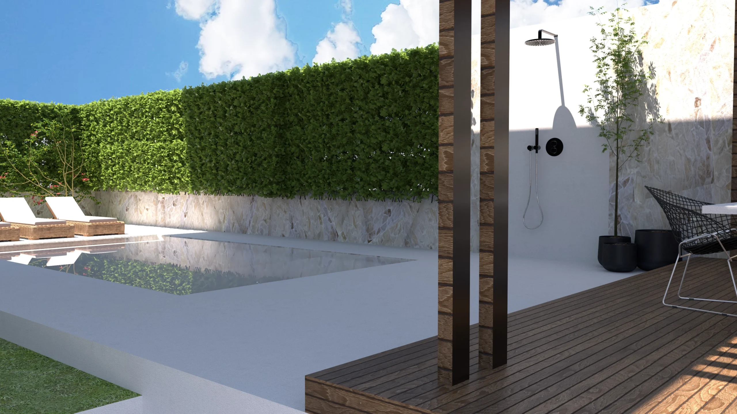 La reforma también incluyó el rediseño completo de la zona exterior. Creamos una piscina, un área chill-out pensada para ver la televisión al aire libre, y una zona de barbacoa con plancha, perfecta para reuniones con amigos y familia.